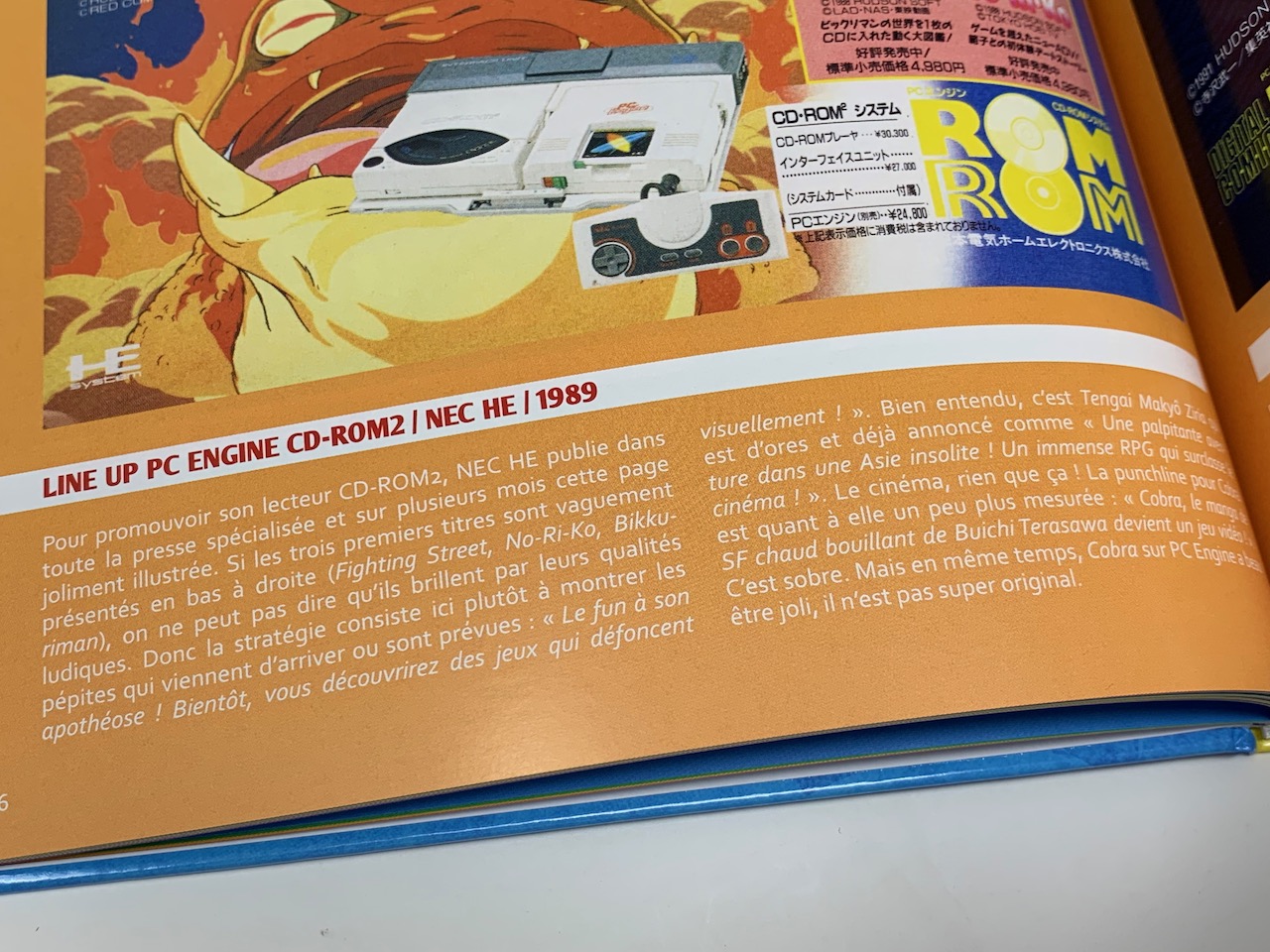 Grâce à plus de 200 scans de publicités sur plus de 600 que possède le collectionneur Eric ROZENBLAT et à la traduction/expertise de Florent Gorges, on apprend plein de choses avec même des documents complètement inédits ! On y découvre les différentes déclinaisons de la PC Engine avec des accessoires (sortis ou pas) plus ou moins chelou mais aussi les prix de l’époque. C’est un peu le témoignage du passage de la PC Engine dans l’histoire du jeu vidéo. Avec toutes ces publicités (traduites et expliquées dans un encart en bas de page) on y apprend, par exemple, des anecdotes à propos de Gunhed qui se ventait d’être meilleur que Super Star Soldier alors que le jeu n’était pas encore sorti (et encore en cours de développement). Bien entendu cela est illustré et expliqué dans le livre. J’ai clairement eu l’impression qu’on me révélait plein de secrets !