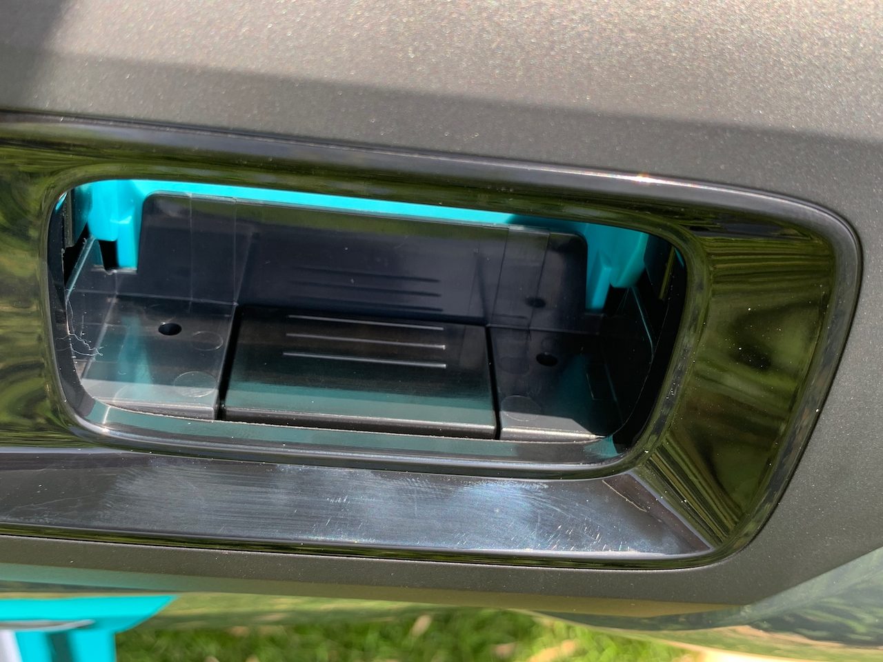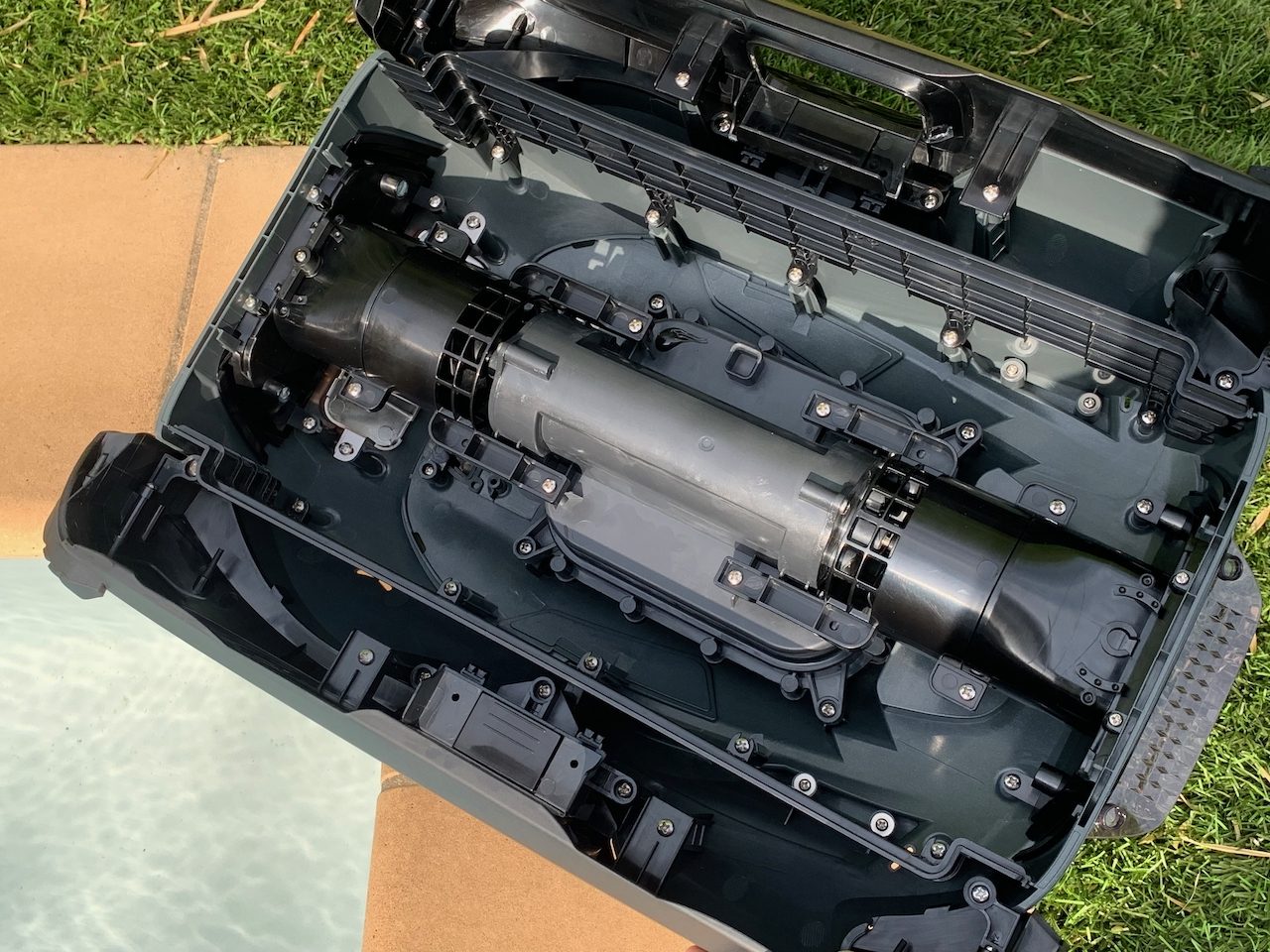 le Seagull Plus a un look aérodynamique qui le plaque bien au sol quand il avance. Dans le cas de ce modèle le robot avance grace au flux d’eau qui sort de l’arrière. Il avance (assez vite j’avoue) jusqu’à heurter le bord du bassin. Une fois fait, c’est l’autre moteur qui assure la propulsion et le sens s’inverse (l’eau sort de l’autre côté)… jusqu’à heurter à nouveau un bord. Au gré de sa progression le robot fait des allers/retours un peu comme il veut/peut. En général je l’amorce dans le sens de la longueur mais il se retrouve rapidement dans le sens de la largeur voire diagonale. Bref, il fait ce qu’il veut en vrai 🙂 Notez qu’il y a des bumpers noirs pour amortir les chocs (sur le côté plus que sur l’avant / arrière ce qui est dommage). Au delà de l’extérieur, ouvrons le robot pour voir l’intérieur. On appuie sur les poignées de chaque côté et on accède au filtre (blanc) et au bac où sont récoltés les déchets. Au passage on voit la zone des moteurs/batterie non accessibles (sous les vis).