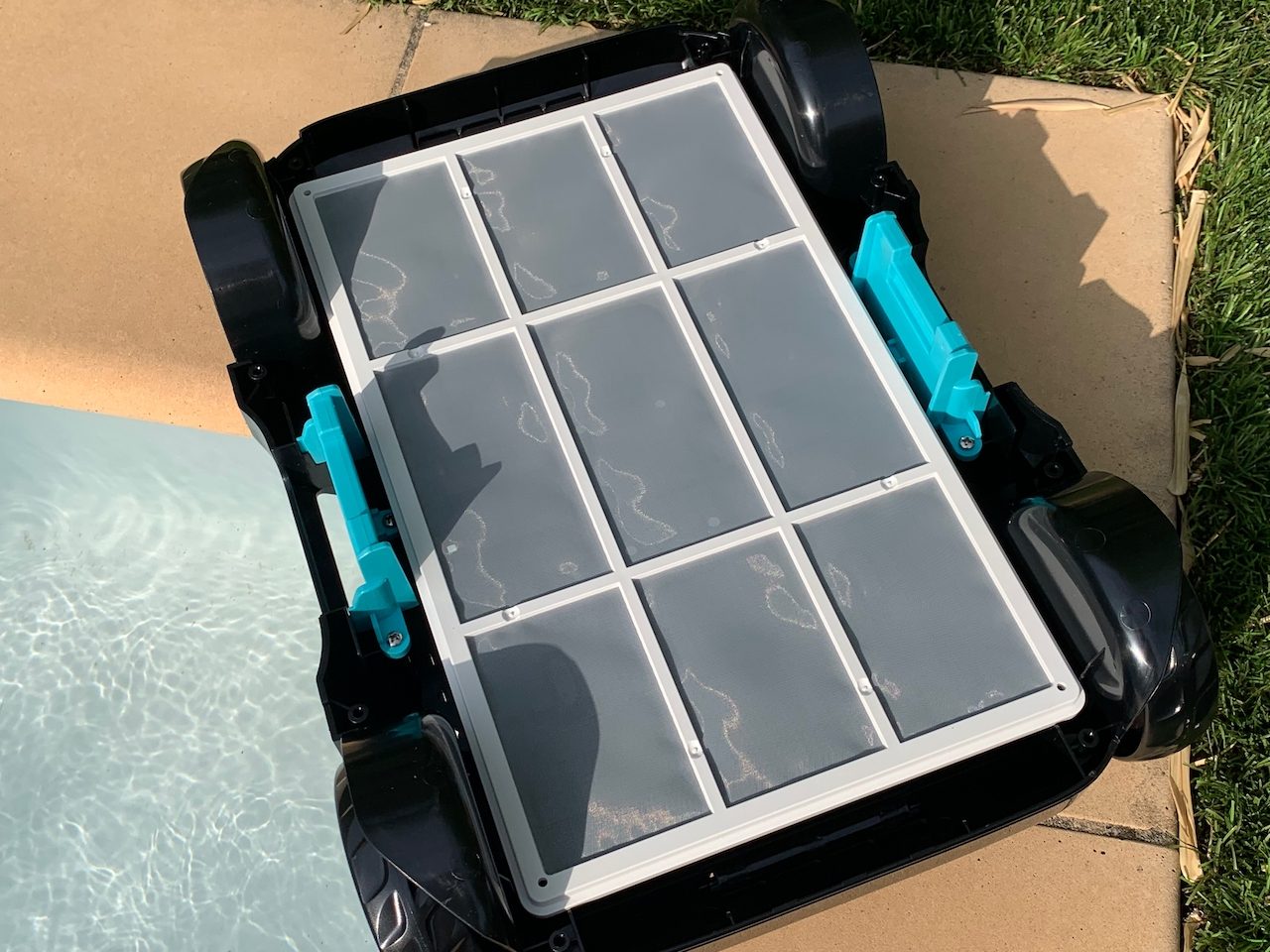 Une fois le robot sorti de l’eau (grâce au crochet fourni qui attrape la poignée), l’eau s’échappe rapidement pour qu’on puisse le soulever hors de l’eau (bonjour le poid sinon). On pourra ensuite facilement accéder au bac de récolte des déchets et au filtre qui a bien joué son rôle.