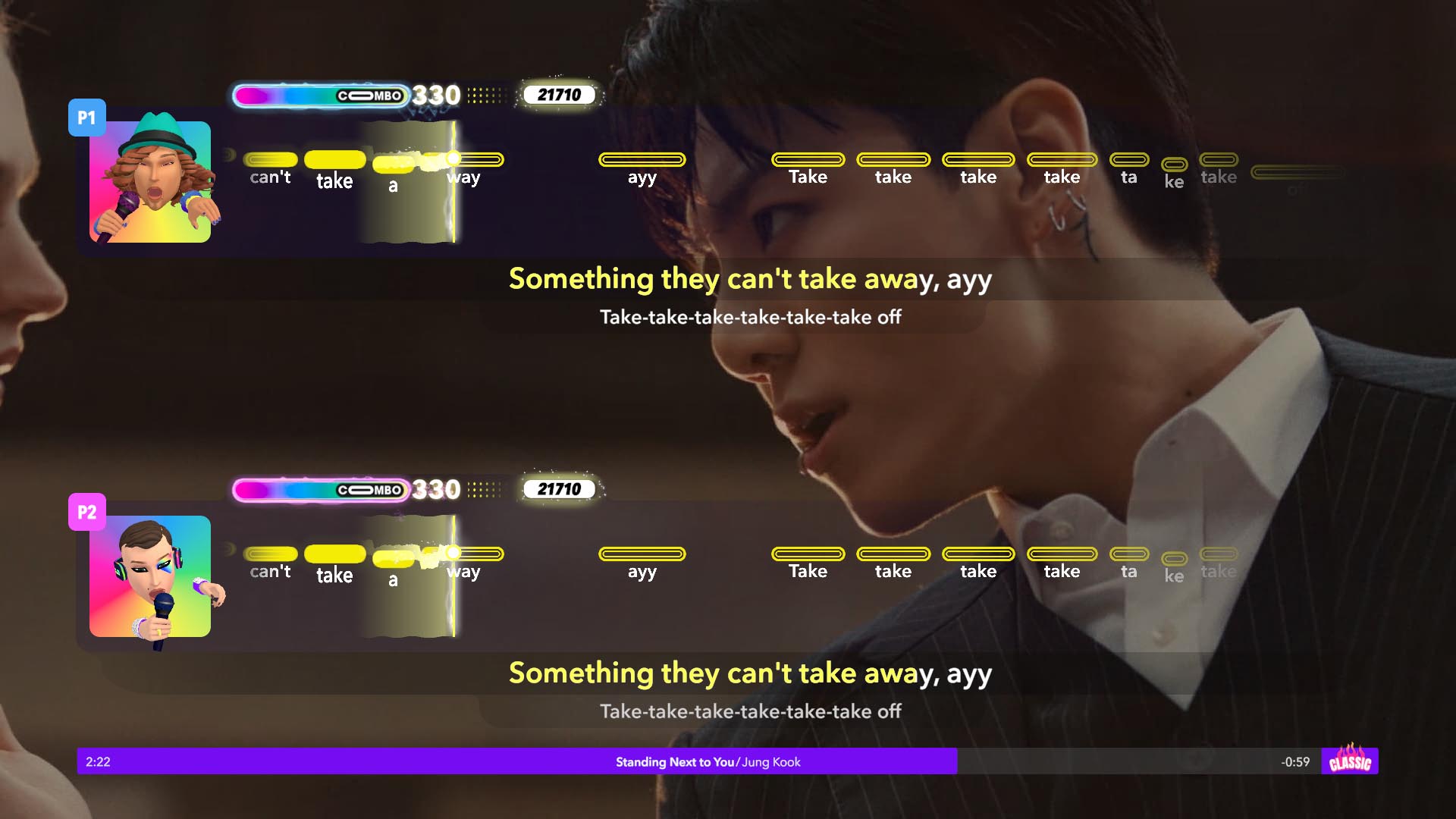 Qui dit nouvelle édition, dit nouvelle selection de chansons interprétées par des stars internationales et françaises (y a même une époque où il y avait plusieurs éditions du jeu dispo). La playlist je vous la détaille plus bas mais il y en a pour tous les goûts croyez-moi (oui il y des titres du moment et des plus anciens). Il y a par exemple les artistes français tels que Keblack, Adèle Castillon, Louane et Mika, ainsi que des talents internationaux comme Ariana Grande, Benson Boone et Jung Kook.Bref, Let’s Sing 2025 a quelque chose à offrir à tout le monde.